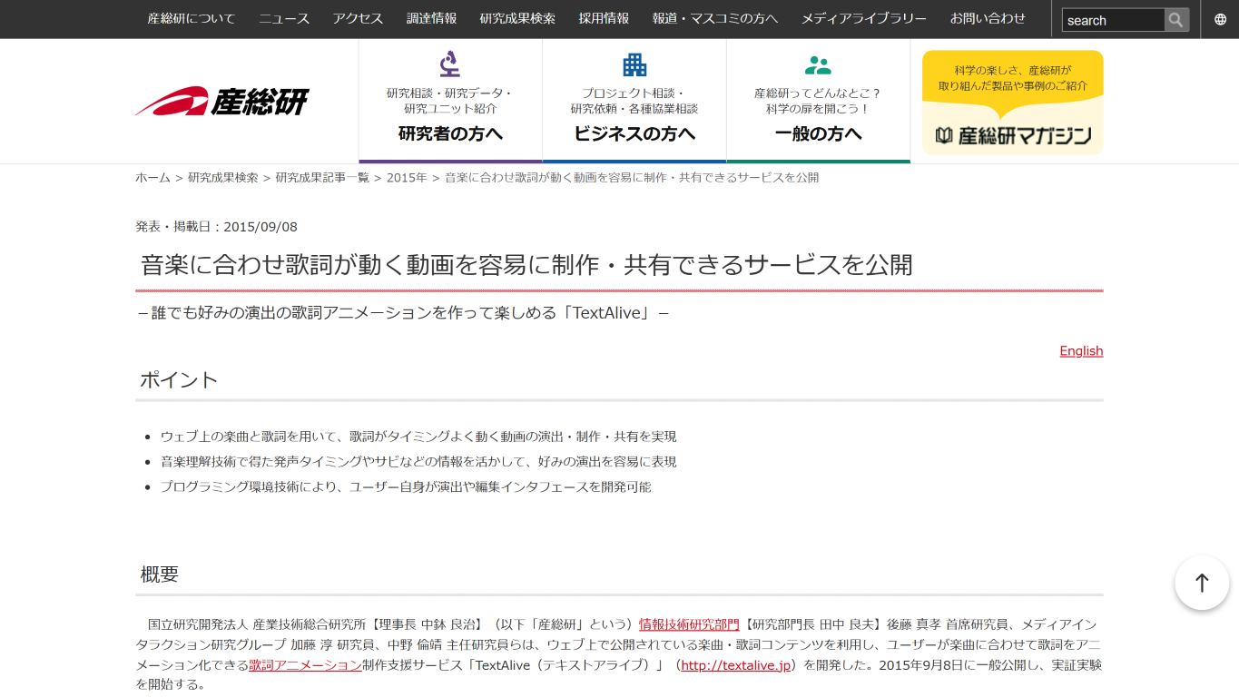 国立研究開発法人 産業技術総合研究所 情報技術研究部門 後藤 真孝首席研究員、メディアインタラクション研究グループ 加藤 淳研究員、中野 倫靖主任研究員らは、ウェブ上で公開されている楽曲・歌詞コンテンツを利用し、ユーザーが楽曲に合わせて歌詞をアニメーション化できる歌詞アニメーション制作支援サービスTextAliveを開発しました。