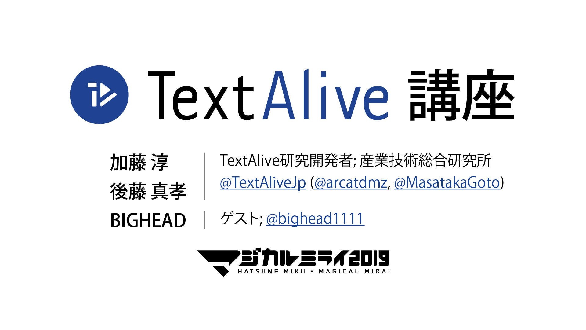 マジカルミライ 2019「TextAlive講座」にお越しいただいたみなさま、ありがとうございました。昨年に続き立ち見の盛況だった大阪、熱心に聴講いただいた東京、どちらも楽しく講演でき、BIGHEAD氏との鼎談も盛り上がりました。アフターレポートとして東京での講座の様子を全編公開しました。